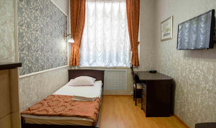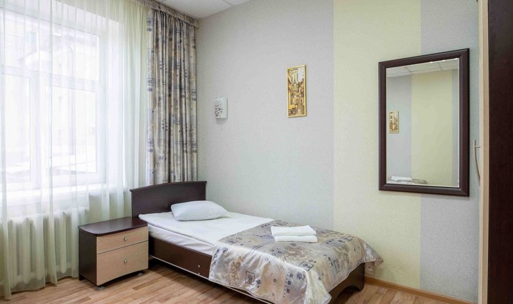 В номере: вешалка, зеркало, кровать односпальная, прикроватная тумбочка, стол, стул, шкаф, телевизор, холодильник