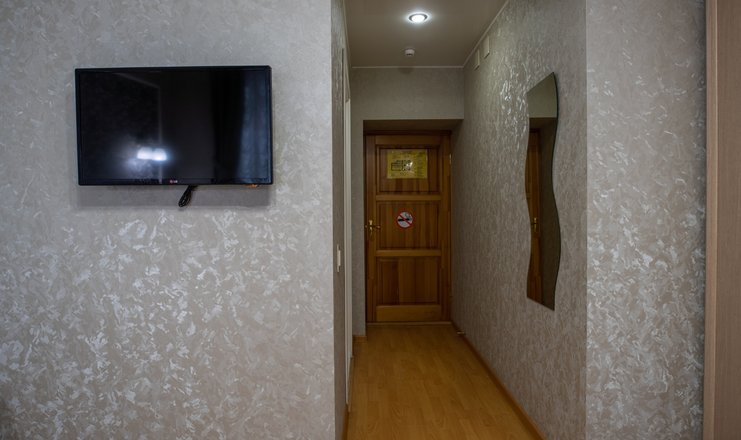 В номере: вешалка, зеркало, кровать двуспальная, прикроватная тумбочка, стол, стул, шкаф, телевизор, холодильник, электрочайник