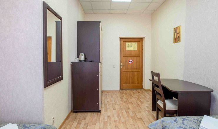 В номере: вешалка, зеркало, кровати полутороспальные, прикроватные тумбочки, стол, стулья, шкаф, телевизор, холодильник, чайный набор посуды, электрочайник