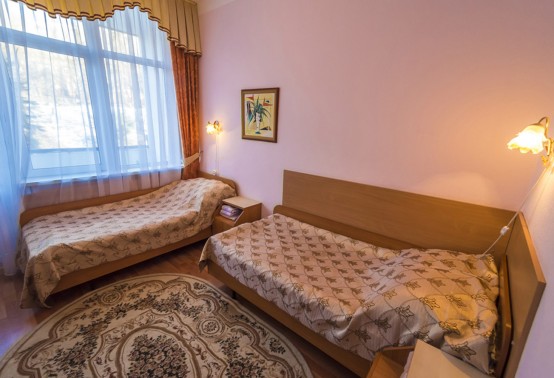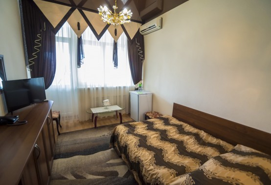 В номере: две односпальные кровати, прикроватные тумбы, встроенный шкаф, стол, кресло (или стул, или пуф), телевизор, холодильник, телефон, набор посуды